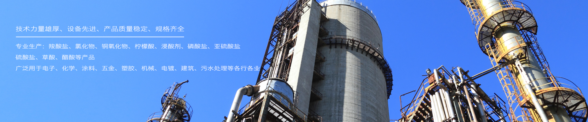主要產(chǎn)品有:羧酸鹽、氯化物、銅氧化物、檸檬酸、浸酸劑、磷酸鹽、亞硫酸鹽、硫酸鹽、草酸、醋酸等,廣泛用于電子、化學、涂料、五金、塑膠、機械、電鍍、建筑、污水處理等各行各業(yè)。